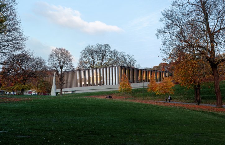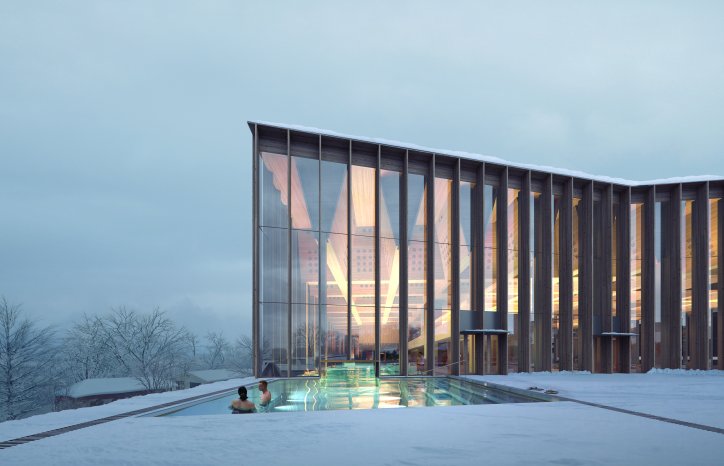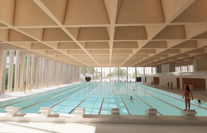 Bygget får en sammenhengende glassfasade ca. 11 meter i høyde rundt størsteparten av bygget, og taket over bassengarealene får hule bjelker i massivtre.